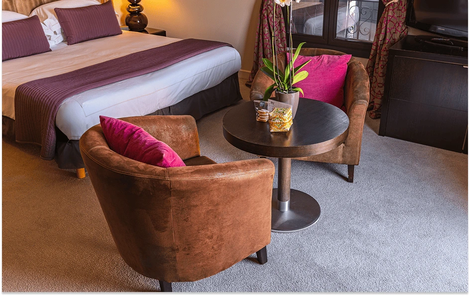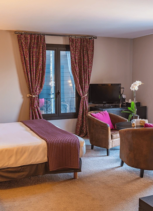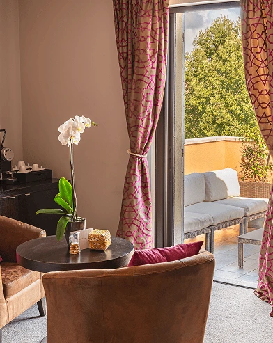 The Junior Suite Ruby harmoniously combines elegance and comfort within a space of 30 to 35 m². Adorned in soft tones of beige or powder pink, it offers a refined atmosphere. The flexible bedding option (king-size bed or twin beds), thick carpeting, and a sleek yet contemporary design ensure optimal well-being. The modern bathroom features a walk-in shower. Outside, a private furnished terrace allows you to enjoy an open view of the Roquebrune Golf Course, the Lachens hills, and the sea below.